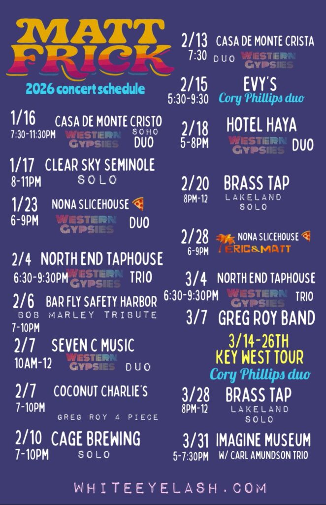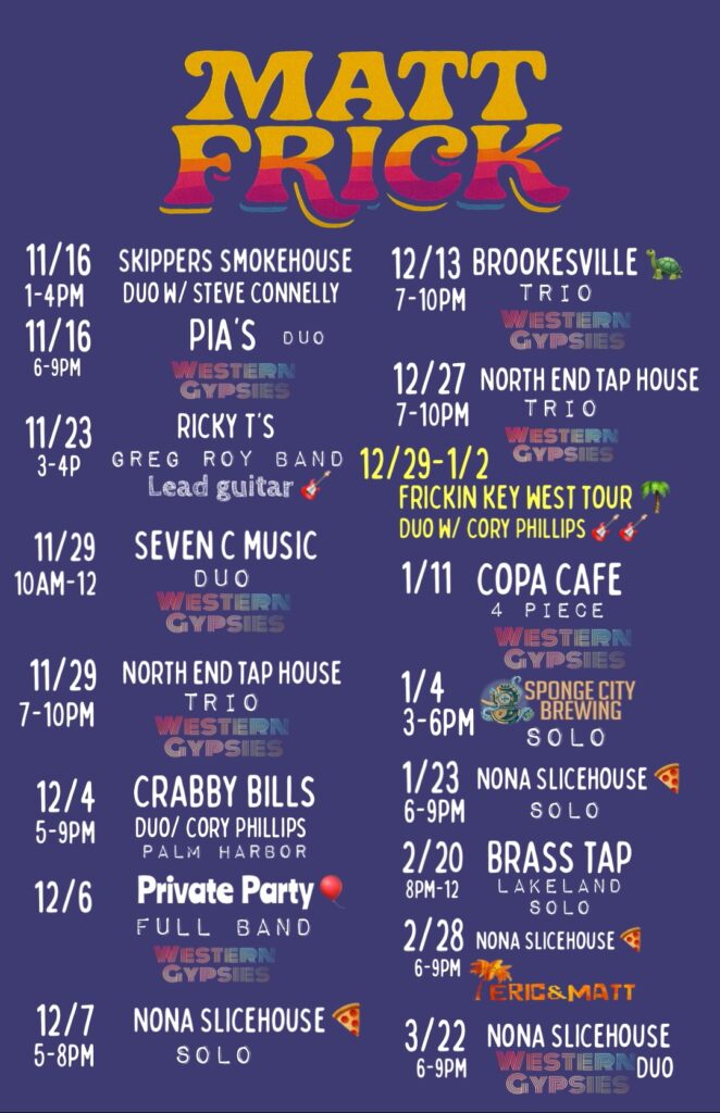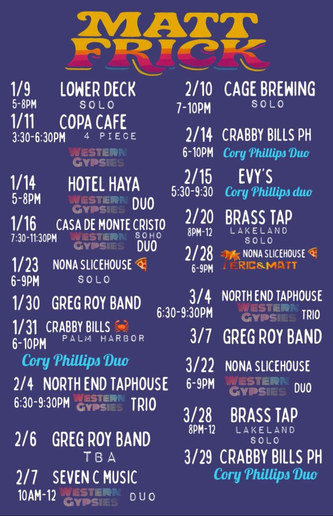 Thanks for checking my live Frickin’ music schedule!!! Here you can see where I’m playing in Tampa Bay, FL. For booking information email mattfrick@ymail.com
